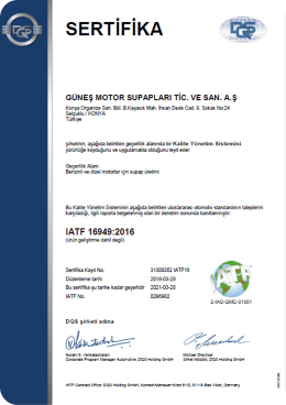 Kullanılan malzemeden, üretime, üretimden satışa ve satış sonrası desteğe varıncaya kadar “kalite”yi bir yaşam felsefesi haline getiren GÜNEŞ, IATF 16949 Otomotiv Kalite Yönetim Sistemi ile çalışmaktadır.